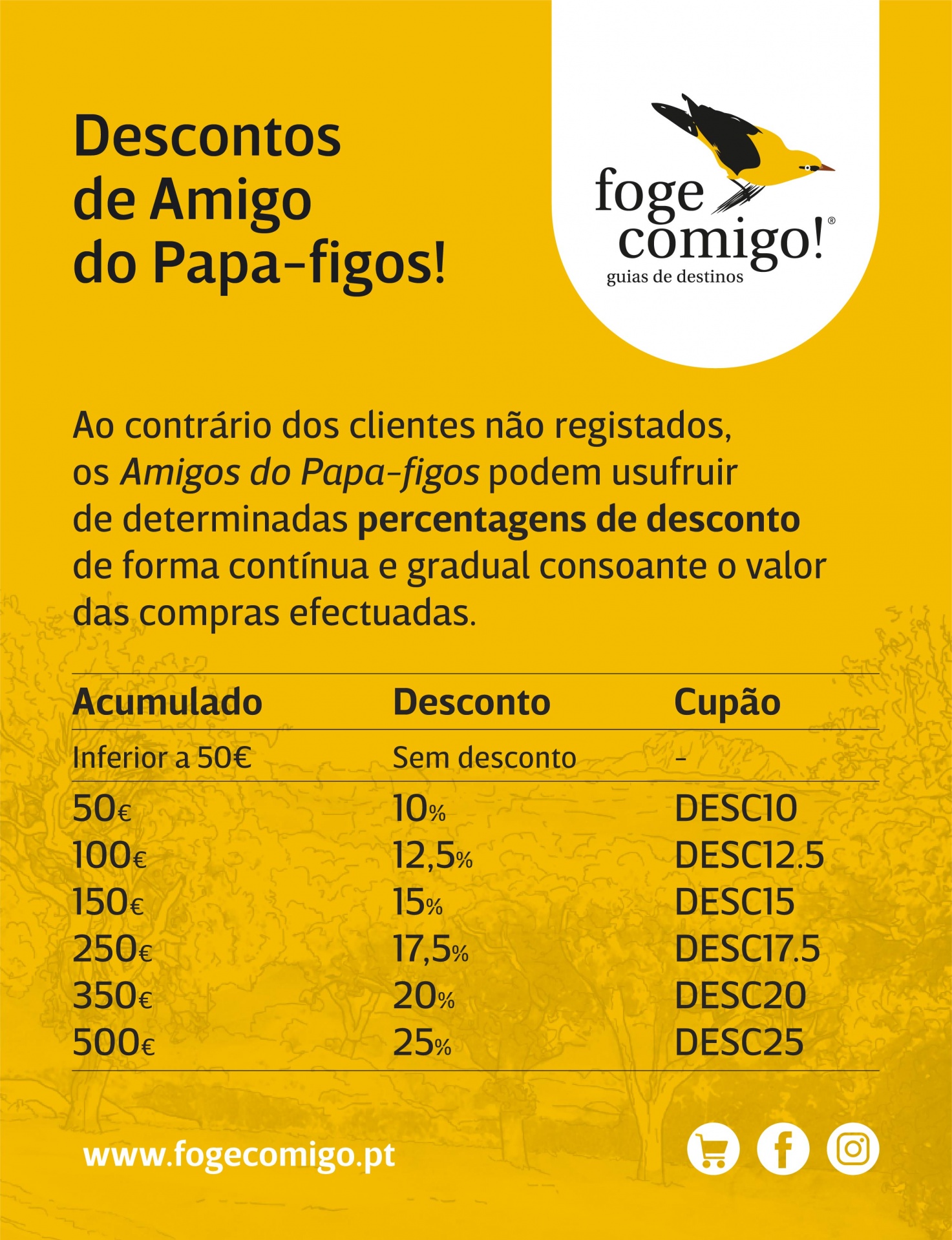 Cada cliente registado terá direito a um desconto mínimo de 10% ao atingir um PVP total de 50€. Embora seja recomendável adoptar o passo descrito no parágrafo anterior, se esta condição se verificar, o cliente poderá inserir o cupão de desconto a que tem direito, mediante valor da encomenda em curso e PVP total do cliente, devendo o próprio responsabilizar-se pelas consequências do uso indevido ou equivocado de cada cupão. Caso a Foge comigo! verifique alguma irregularidade associada ao uso de cupões de desconto associados ao PVP total de cada cliente, reserva-se ao direito de: