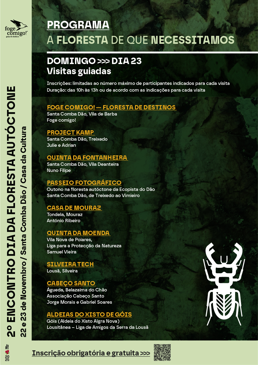 A foge comigo!, juntamente com as quatro Áreas Protegidas Privadas nacionais - Faia Brava, Fraga Viva, Montado do Freixo do Meio e Vale das Amoreiras - e a Eco Rede do Dão, e com o apoio da Câmara Municipal de Santa Comba Dão, organizam pelo segundo ano consecutivo, no fim-de-semana de 22 e 23 de Novembro, o Encontro que assinala de forma singular o Dia Nacional da Floresta Autóctone.