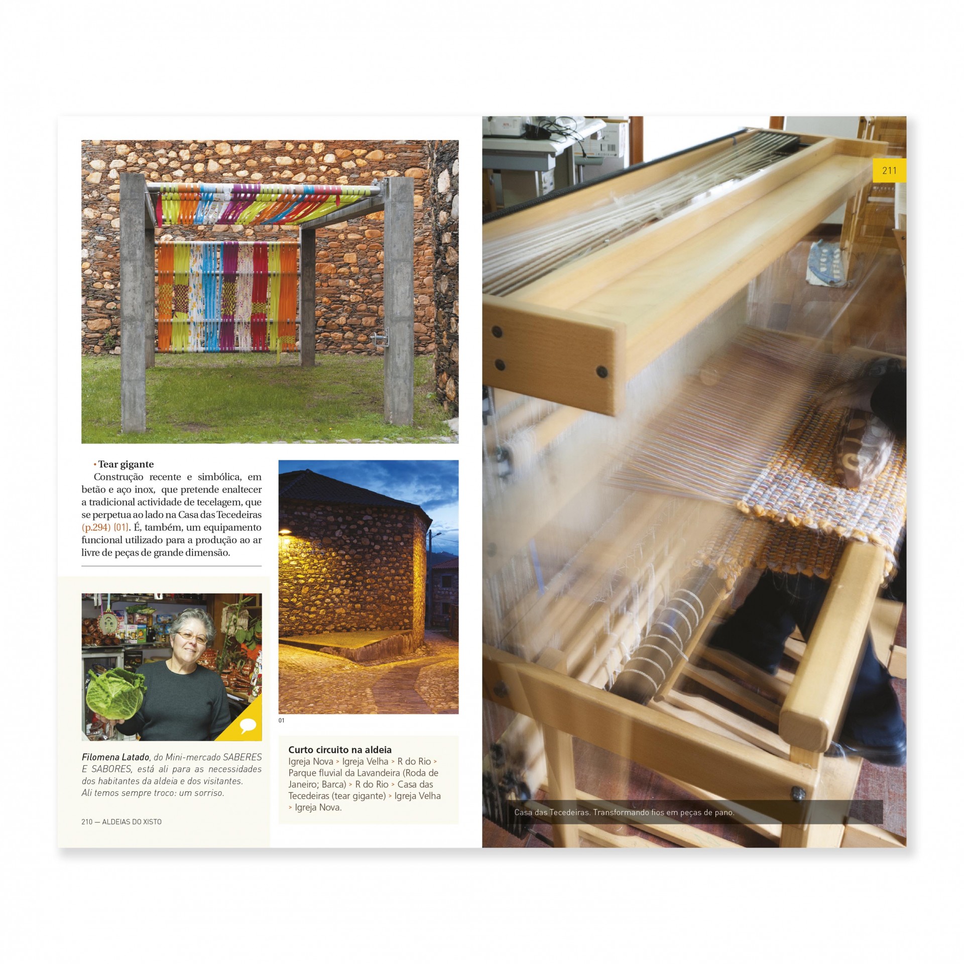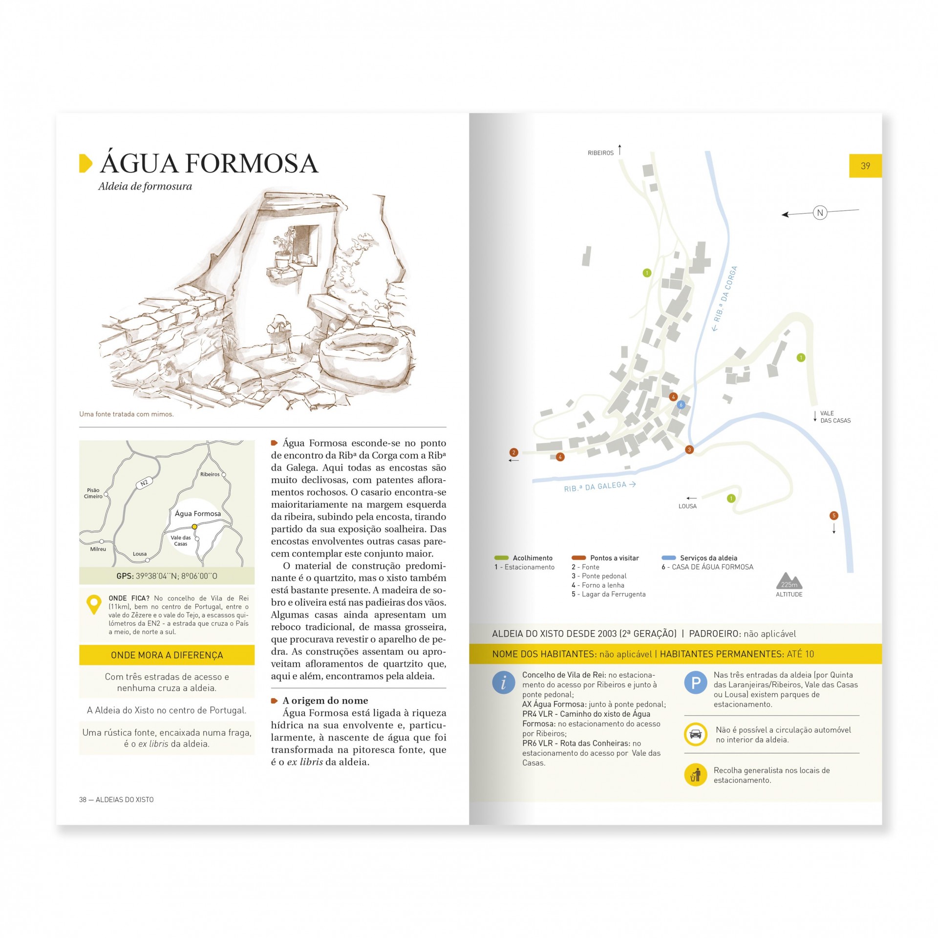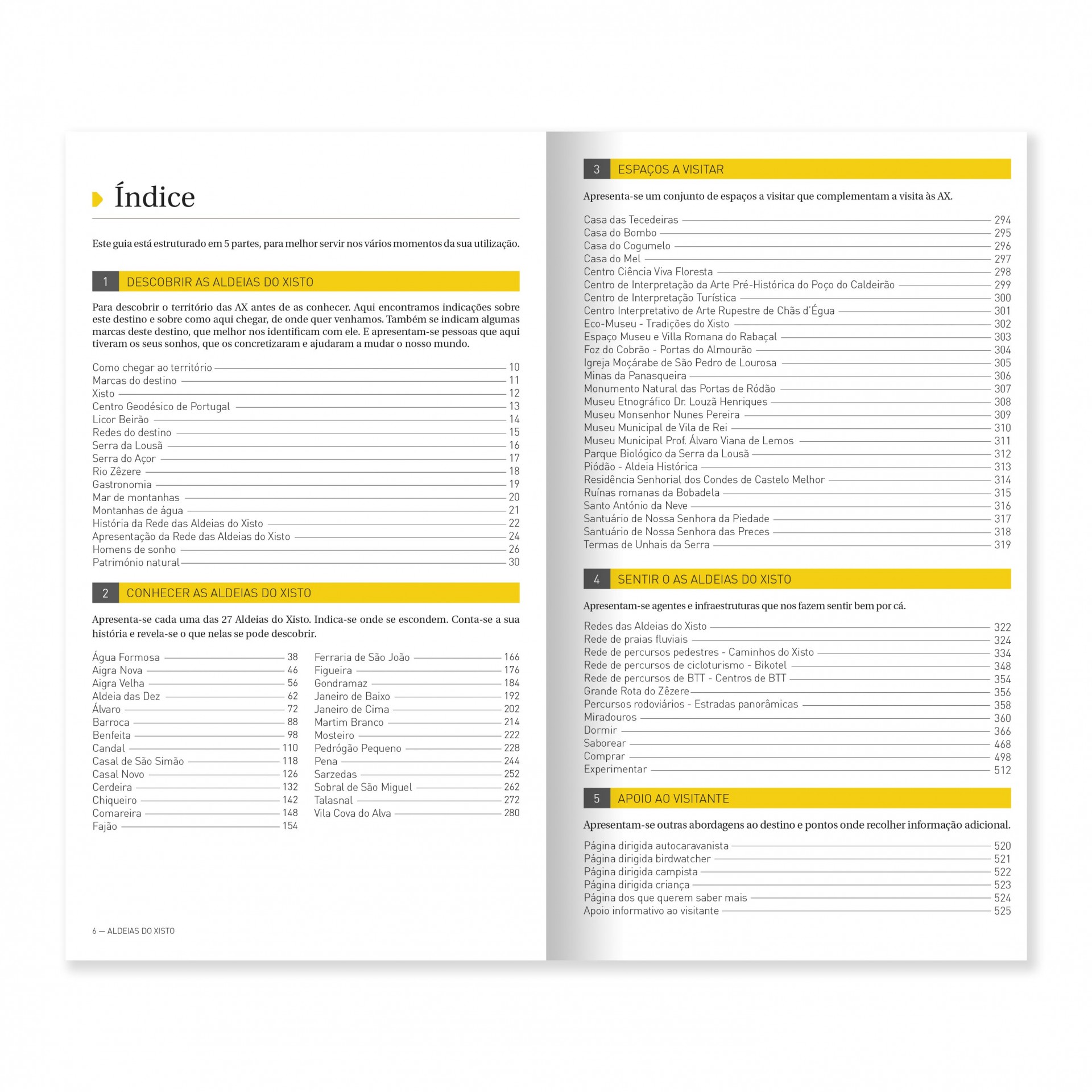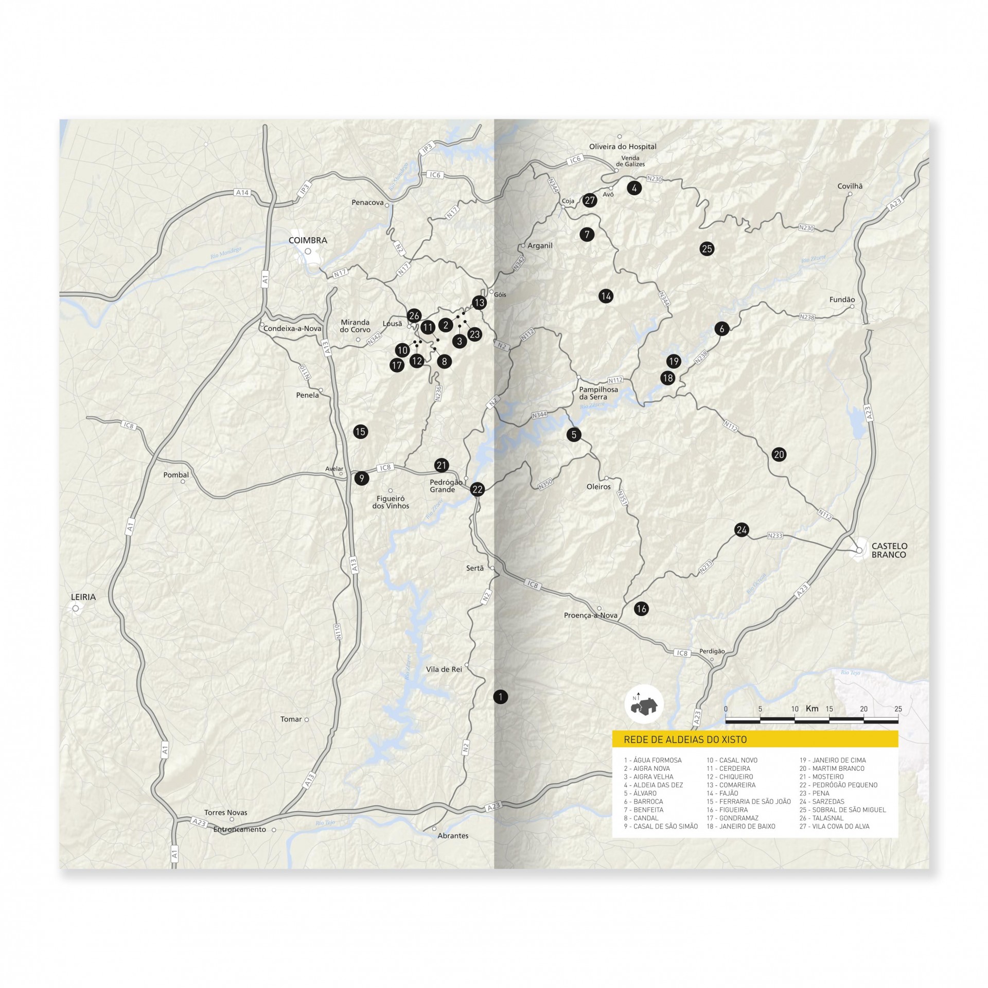 As Aldeias do Xisto são apresentadas uma-a-uma numa perspectiva de descoberta com base numa planta da aldeia, num vasto conjunto de informações, numa lista de aspectos a não perder. A saída da aldeia é apoiada num conjunto de alternativas e sugestões para continuar a descoberta.